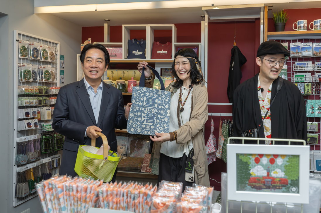 总统赖清德与访宾先至纪念品中心,赖总统以日文欢迎两位嘉宾到访台湾,并表示过去曾