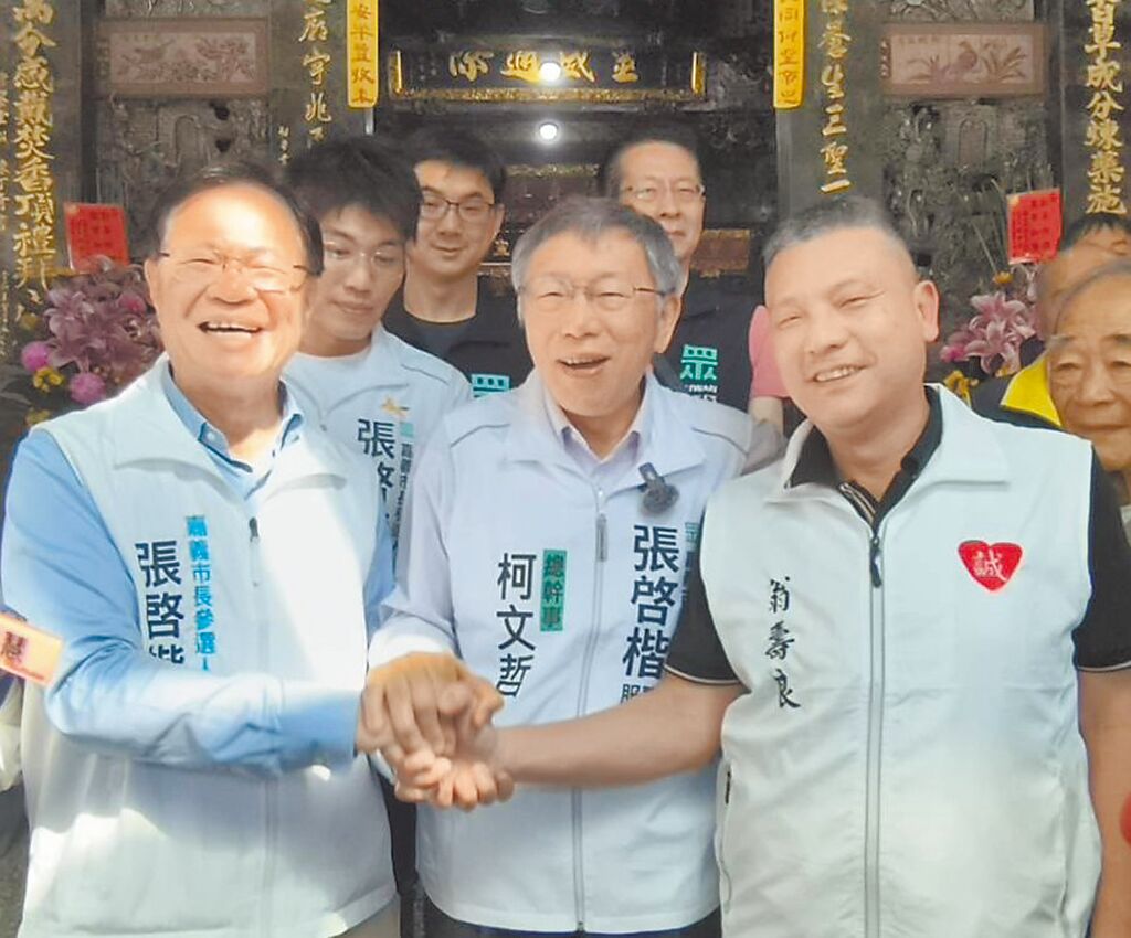 民众党前主席柯文哲(中)22日到嘉义市大天宫参香,拉着民众党提名市长参选人张啓楷