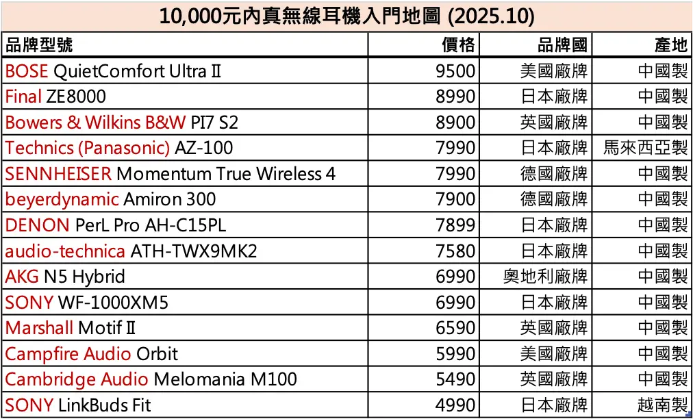 1. 考量真无线耳机汰换特性,以10,000元内为价格区间