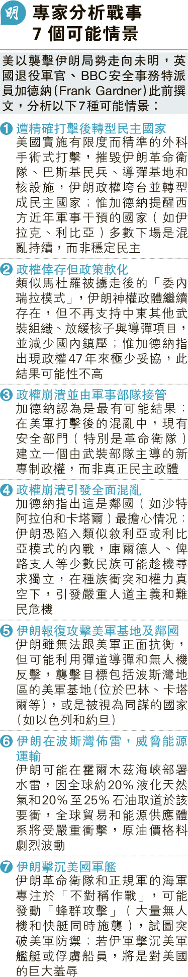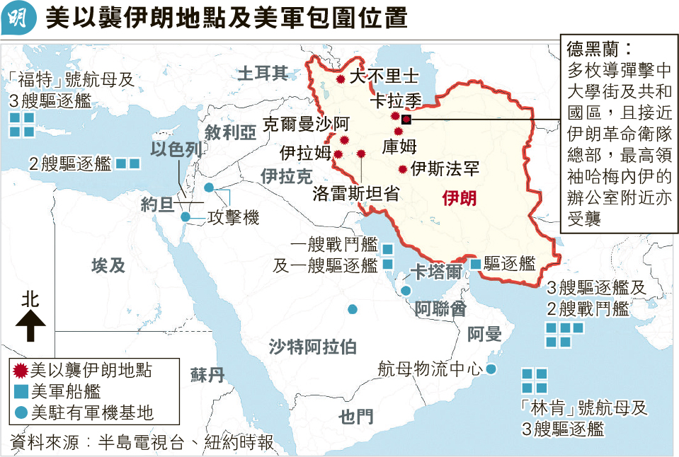 【明报专讯】美国和以色列昨天(2月28日)展开攻击伊朗行动,轰炸全国多地数百军事