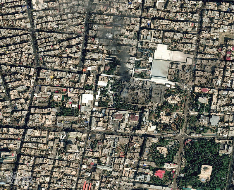 卫星影像显示,伊朗最高领袖哈梅内伊的办公室建筑受到空袭後冒出黑色浓烟。哈梅内伊