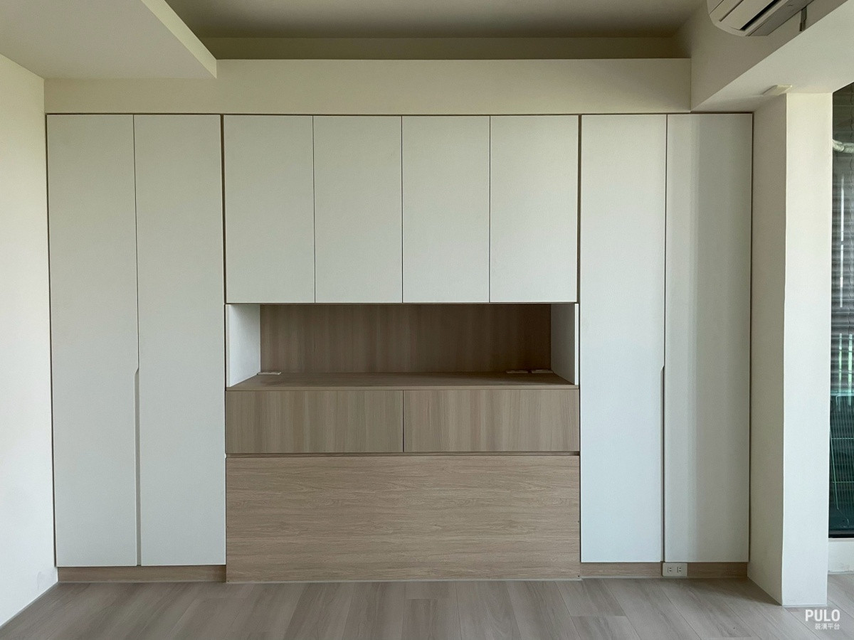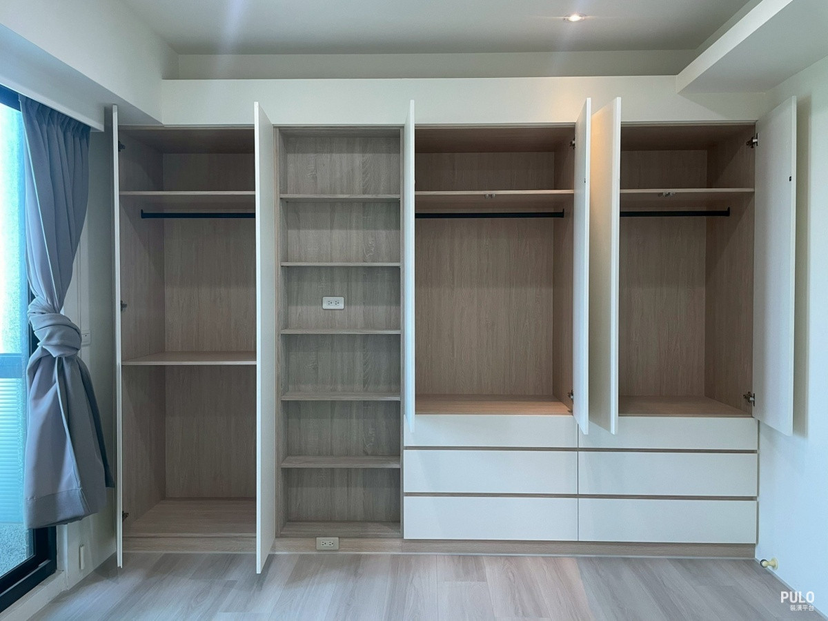这次装修的重点放在木作柜体,统包师傅针对不同卧室的收纳需求,规划出不同型态的收 纳橱柜配置。 -满墙收纳柜设计 其中一间卧室做了整面墙的大型衣柜。师傅先拆除原有的旧柜体,把墙面修补平整後,再 沿着墙面从地板做到天花板。
