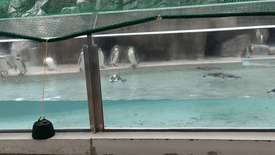 工作人员把一桶食物鱼霸气抛进水里,成群企鹅跳水下去敏捷游泳吃鱼