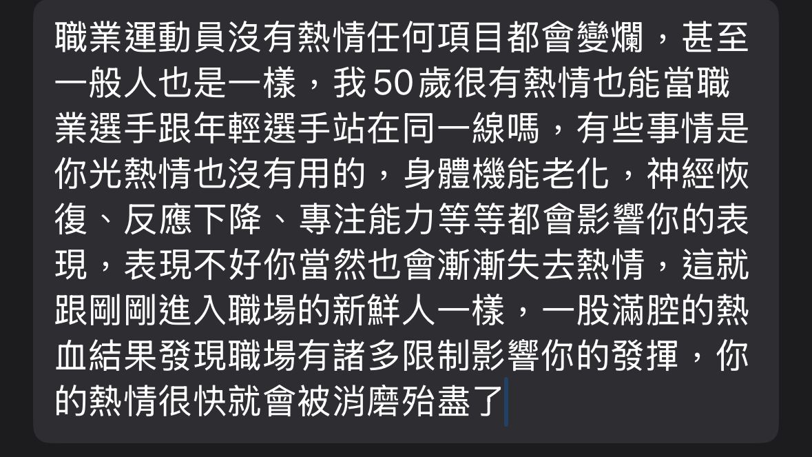 : 己不去意识年龄,专注於该做的事并努力练习,实力只会上升,不会下降。虽然到了