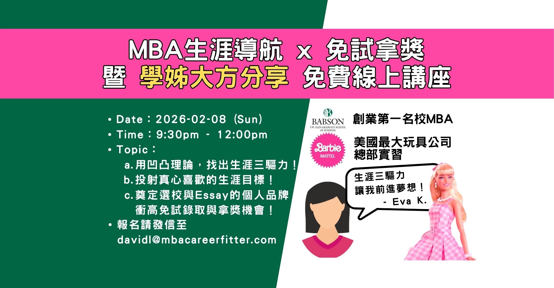 2月8日MBA生涯导航 x 免试拿奖 暨 学姊大方分享 免费线上讲座|李大卫全球MBA申请