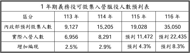 一年期义务役方面,国防部指出,内政部预判113年一年期义务役徵集人数9127人,实际