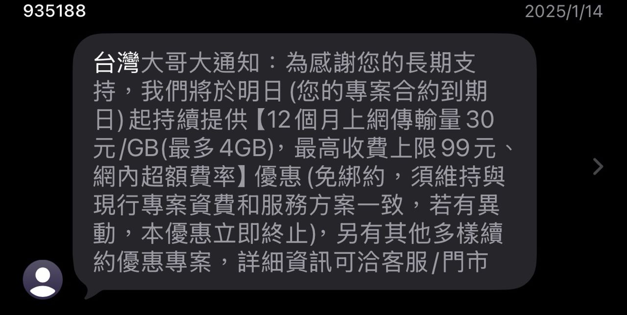 首次」约满一年时,台哥发的简讯也只是告知「次年」沿用原有方案及优惠内容,亦无提