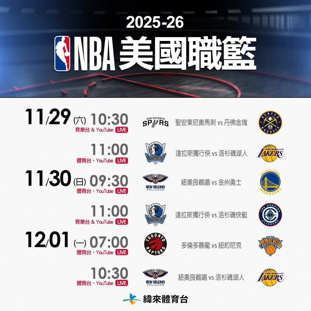 │ 2025-26 例行赛 (台湾时间) ESPN NBC Amazon Taiwan 纬来 │