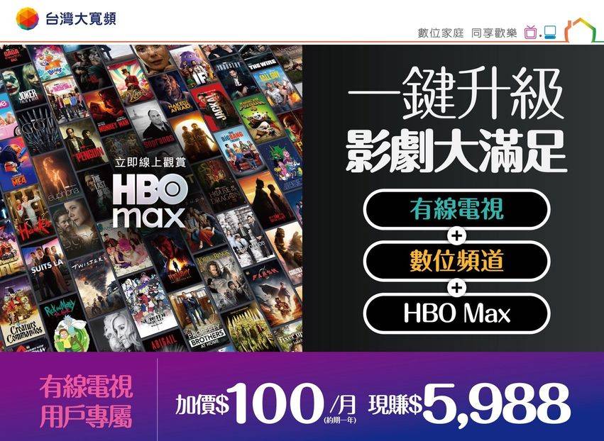 标题[情报] 台湾大宽频家庭剧院升级方案 月付百元畅享HBO Max与数位频道