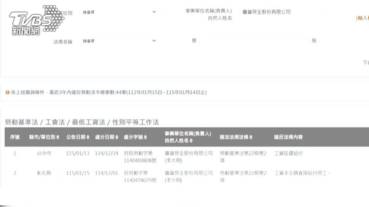 透过劳动部违反劳动法令事业单位查询系统显示,该保全公司有多次遭罚纪录。