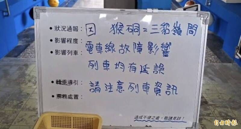 位於新北市瑞芳区的台铁猴硐车站,台铁在月台白板告知旅客,因电车线故障造成列车延