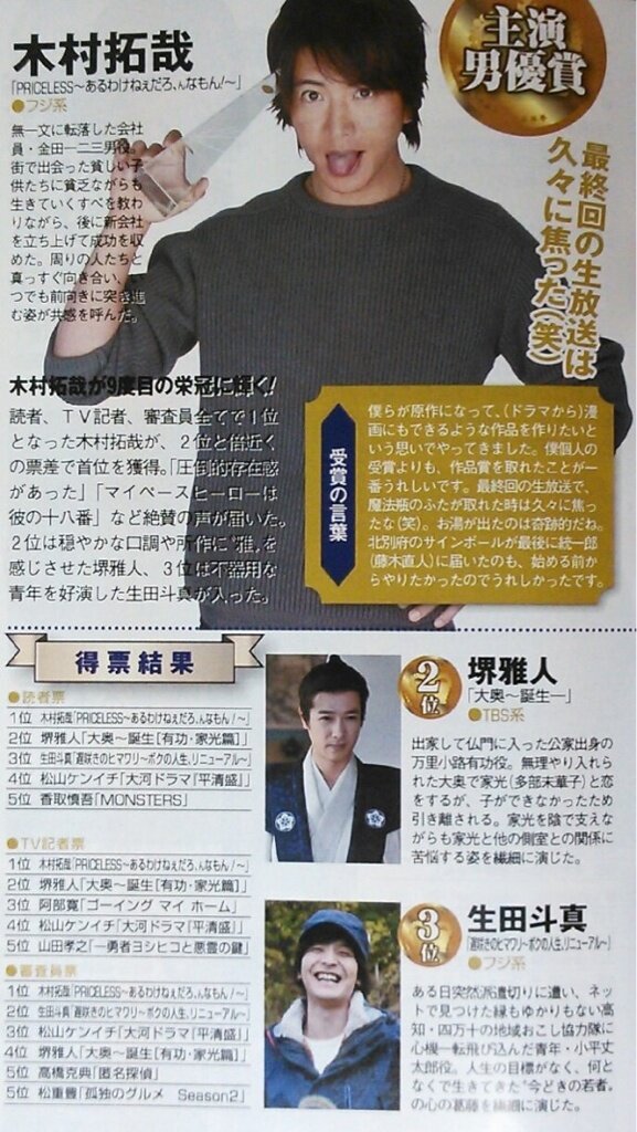 [1]木村拓哉(PRICELESS) [2]堺雅人(大奥~诞生) [3]生田斗真(迟开的向日葵)
