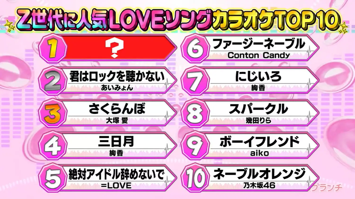 标题[乃木] Z世代人气情歌卡啦OK排名(前10名)