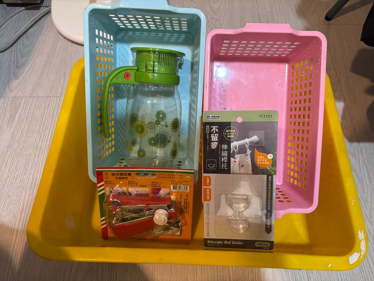 两个小收纳篮、大塑胶盆、玻璃水瓶、迷你缝衣机、伸缩杆托