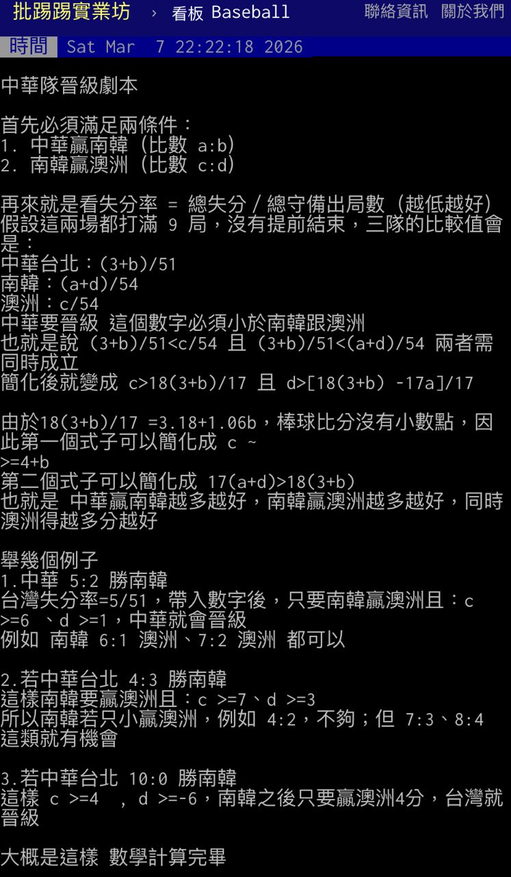 29F:推 john183: 台湾晋级条件:比分是3+:8+ 韩国赢澳洲 36.235.74.45 03/08 15:18