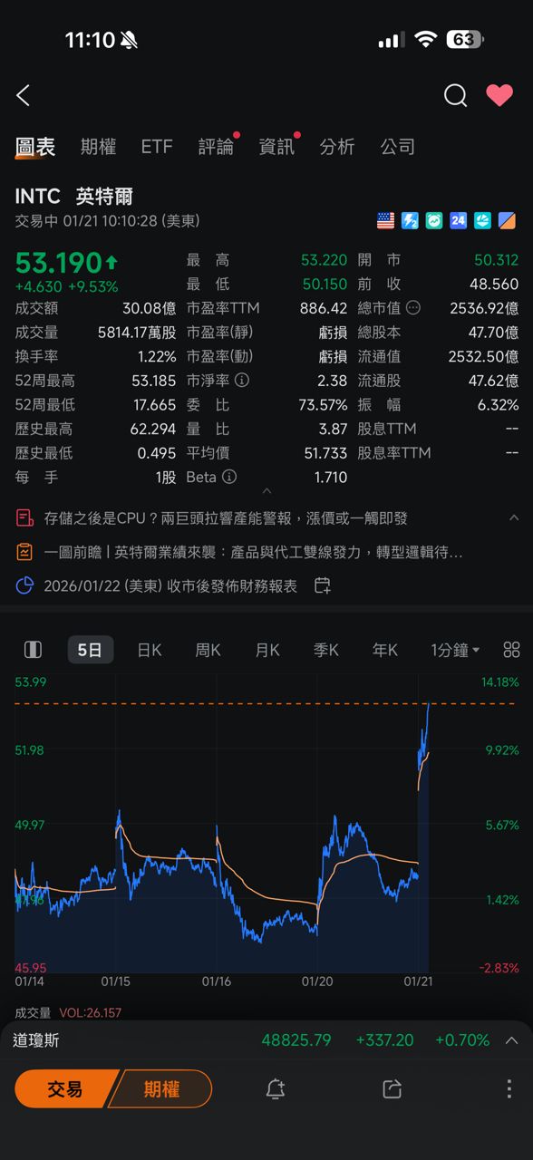 1421F:嘘 yulin0619 : 费半8000点 罗唯仁概念股英特尔喷11% 喷喷喷 01/21 23:36