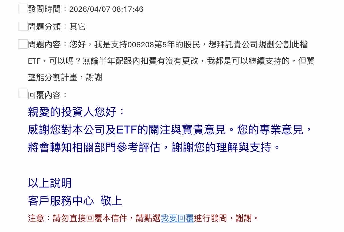 : 」引发讨论後,因未提及「006208」让网友热议「怎麽没推荐富邦自家006208?」对此林