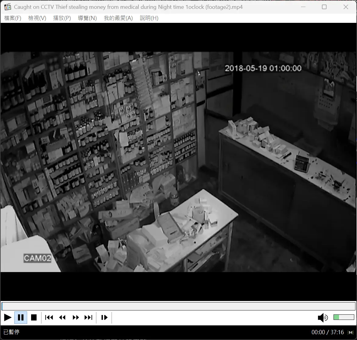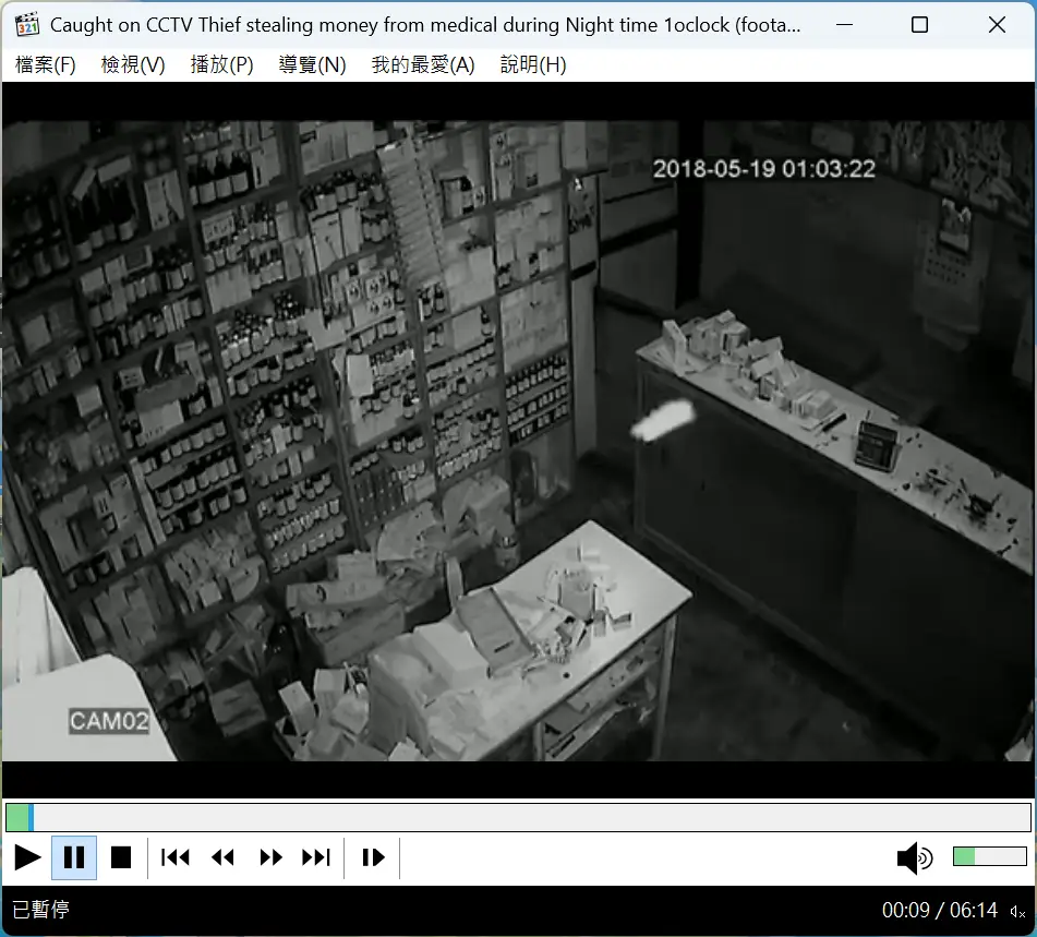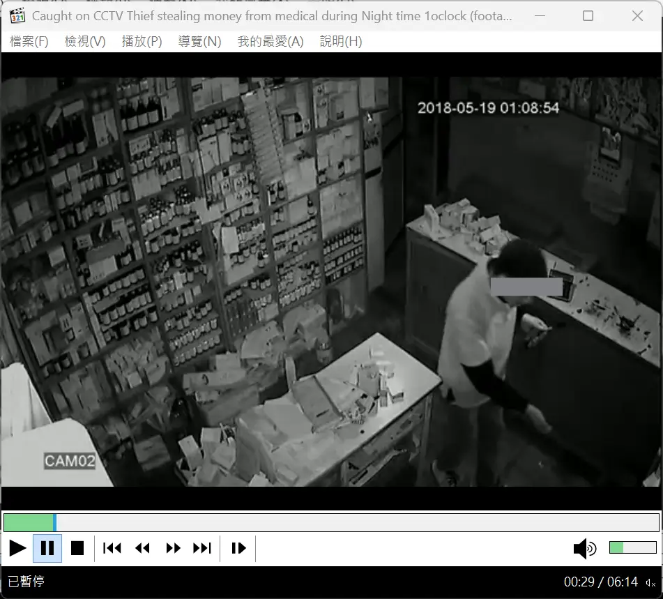 - 范例影片(来源自 Youtube - Caught on CCTV: Thief stealing money from medical during Night time 1o'clock (footage2)):