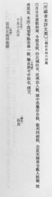 通书上杉家臣高梨、本庄,要他们协助织田家在平定越中跟能登後,持续入侵越後的战事