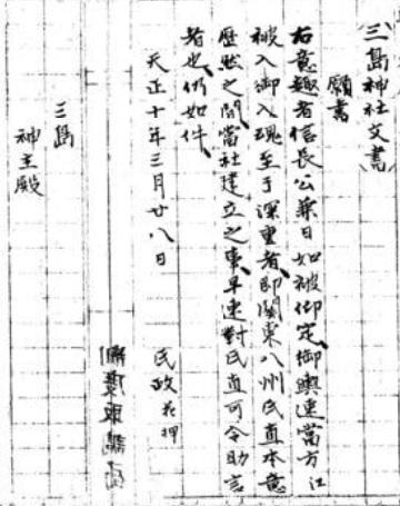 按照三岛神社文书,北条氏政在天正十年三月二十八日,於武田胜赖国灭身亡後,祈愿跟
