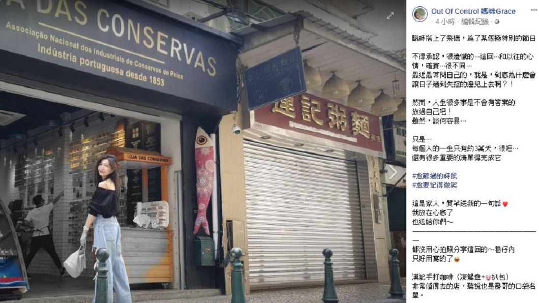Grace今(28日)在脸书坦言,最近最常问自己,到底为什麽会让日子过到失控的边儿上去