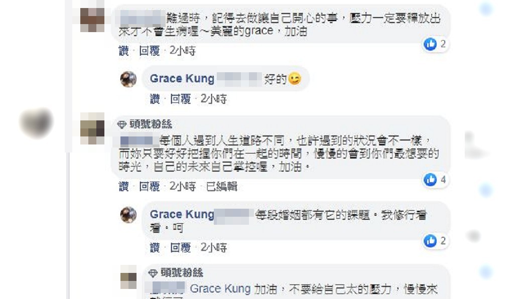 自己的未来自己掌控喔,加油」,钓出Grace本尊回应,「每段婚姻都有它的课题,我修