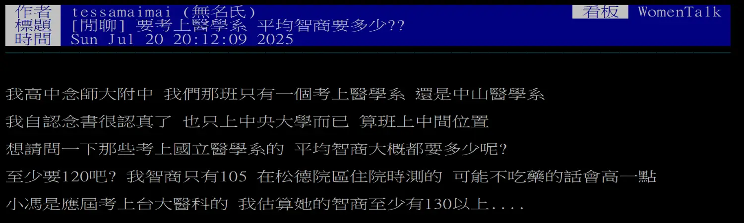 179973 6 7/20 tessamaimai □ [闲聊] 要考上医学系 平均智商要多少??