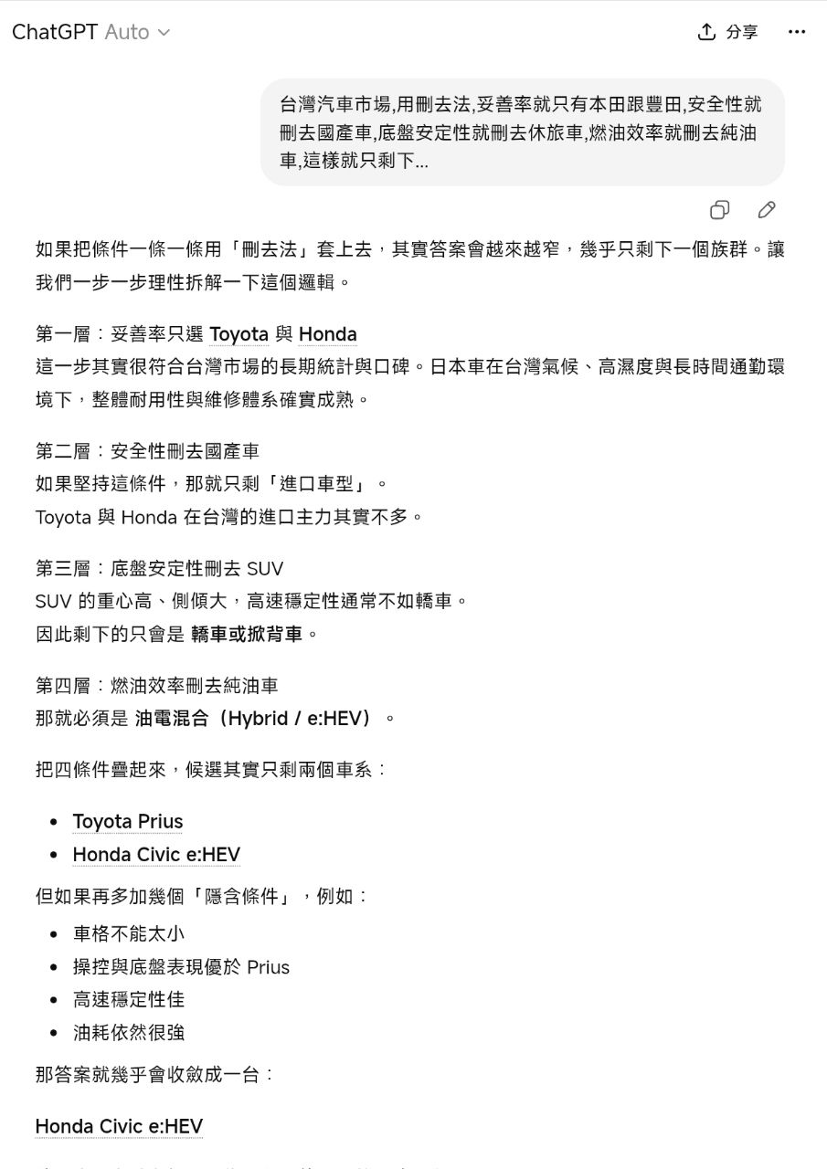 162F:→ Benefits: 性就删去国产车,底盘安定性就删去休旅车,燃油效率就删去 03/14 19:24