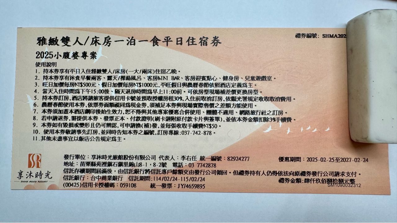 标题[交易]苗栗 享沐时光 温泉饭店双人 平日住宿卷
