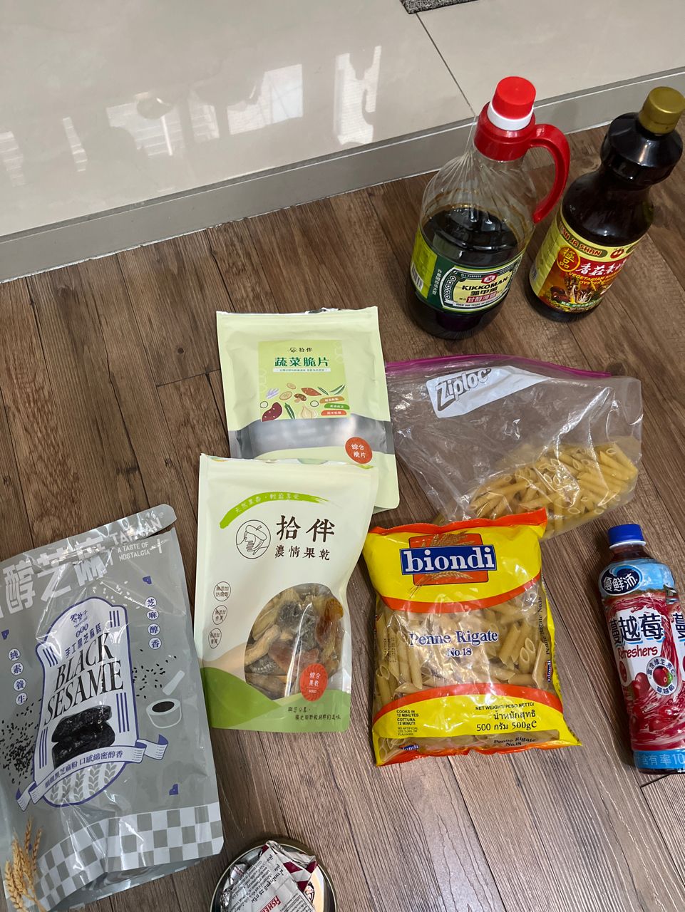 物 品:义大利面 黑芝麻糕 果乾 酱油