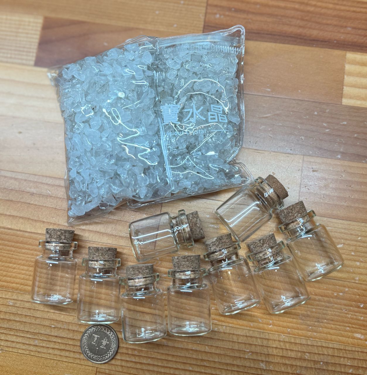物 品:软木塞小玻璃瓶9个+白水晶碎石2小包