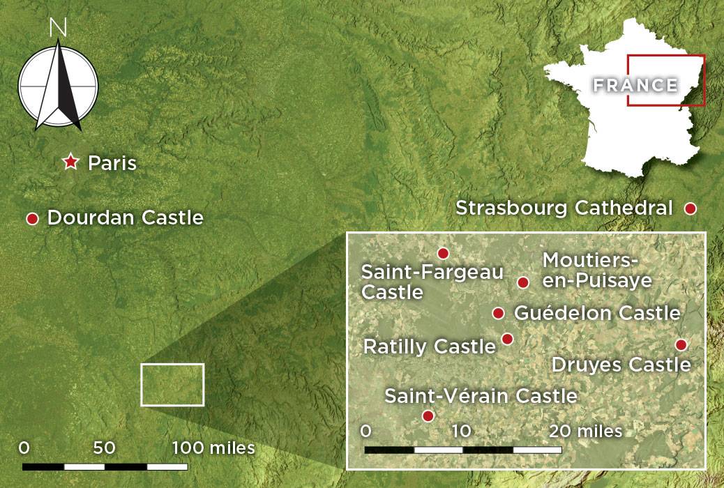 於盖德隆西北方5.5英里的圣法尔戈城堡(Saint-Fargeau Castle)时,发现了一些令人震