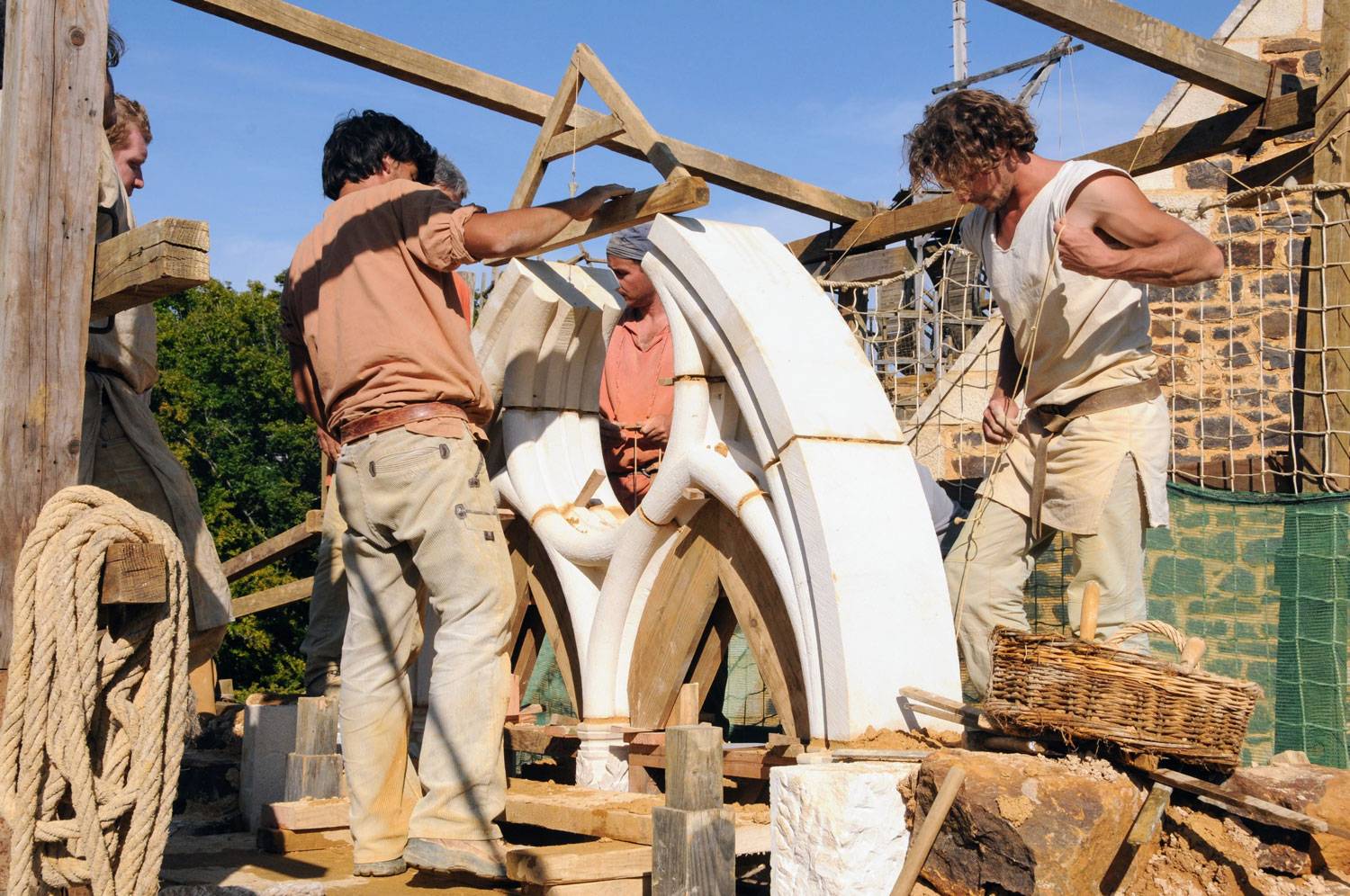 许多工匠穿着当时的服装,最初尝试用山羊皮材质的面板制作教堂塔楼的窗户,因为