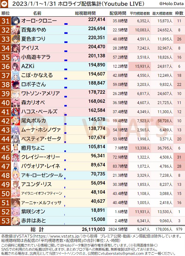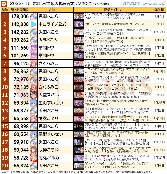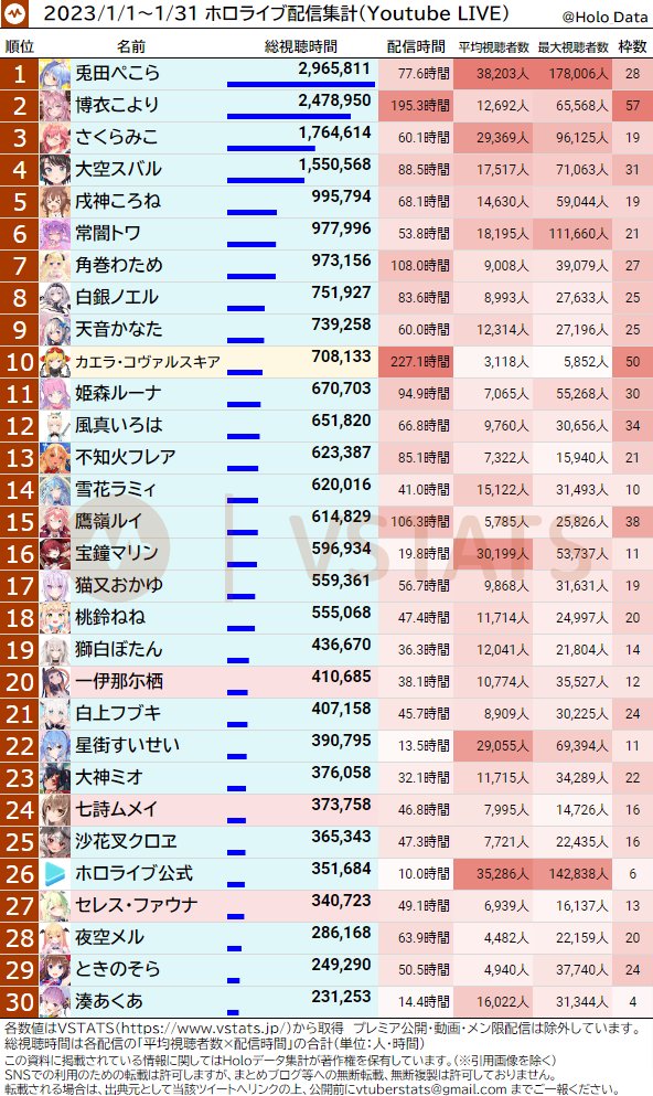 1.Pekora配合兔年举办"全人类兔化计画",1月份中位数突破4万。