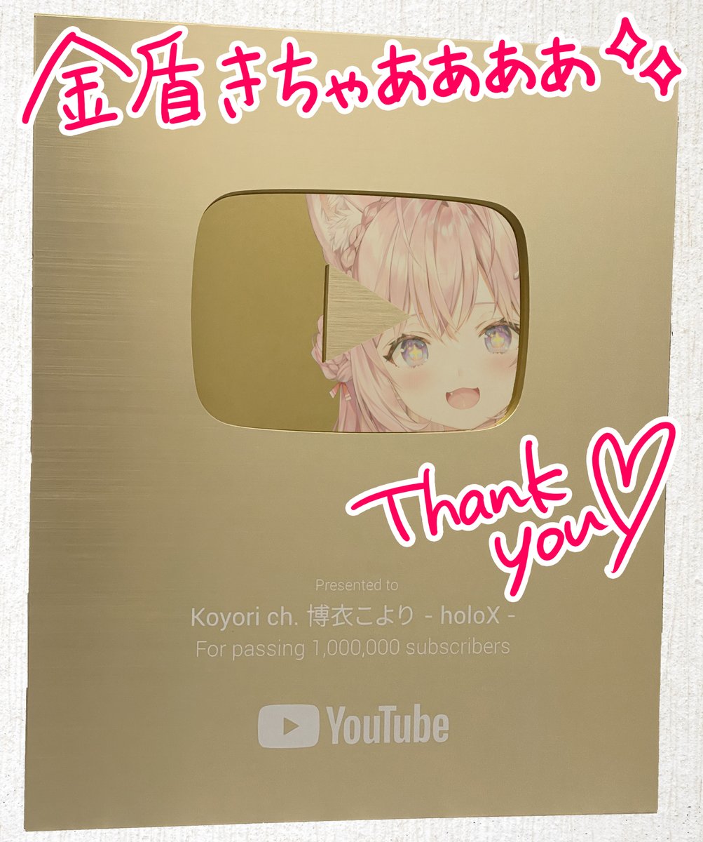 Koyori收到YouTube频道100万订阅金盾