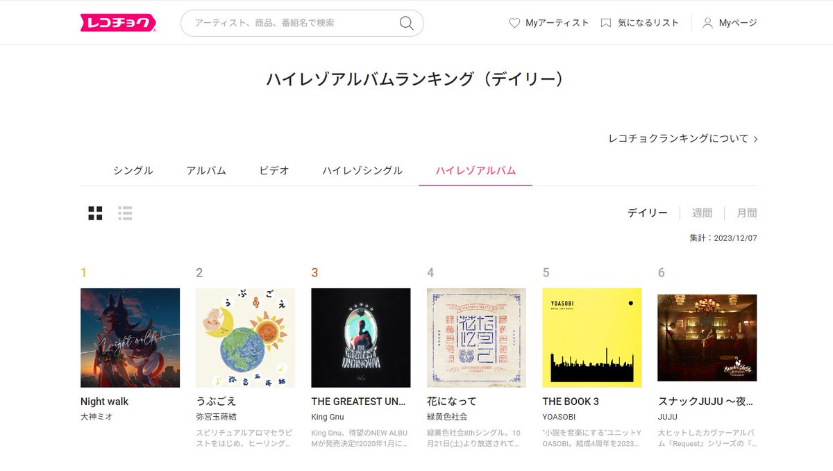 Mio专辑"Night walk"在recochoku高解析度专辑排行第一