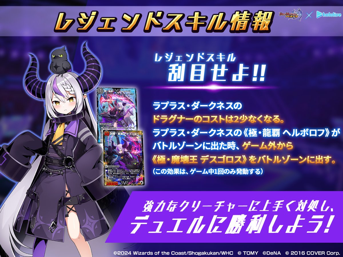 Hololive连动传说技能:YMD 自己的回合中,第一次破坏对方的生物时, 随机从游戏外召唤卡名中有「Yes」「My」「Dark」其中之一的未进化生物 --