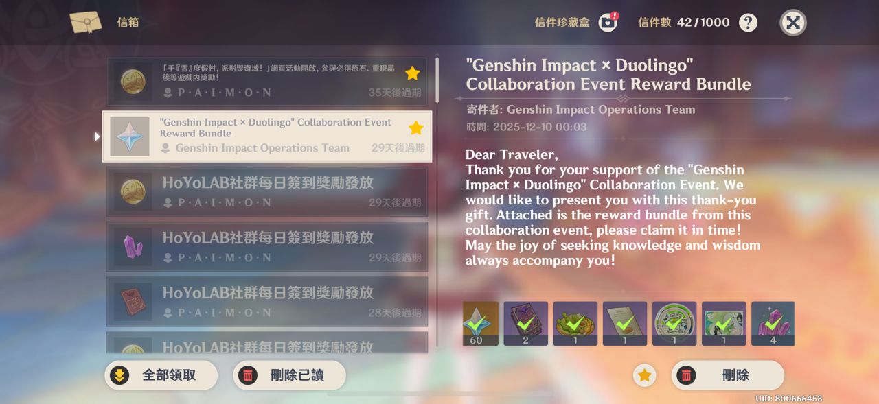 标题Re: [原神] 多邻国Duolingo合作 游戏内报酬