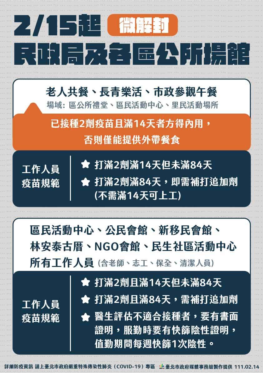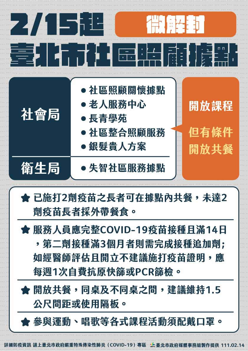 此外,社会局与卫生局社区照顾据点可上课,有条件共餐,已打2剂疫苗长者可内用、未