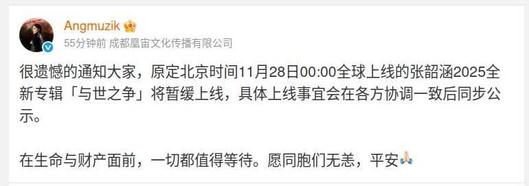 很遺憾的通知大家,原定北京時間11月28日00:00全球上線的張韶涵2025全新專輯「與世