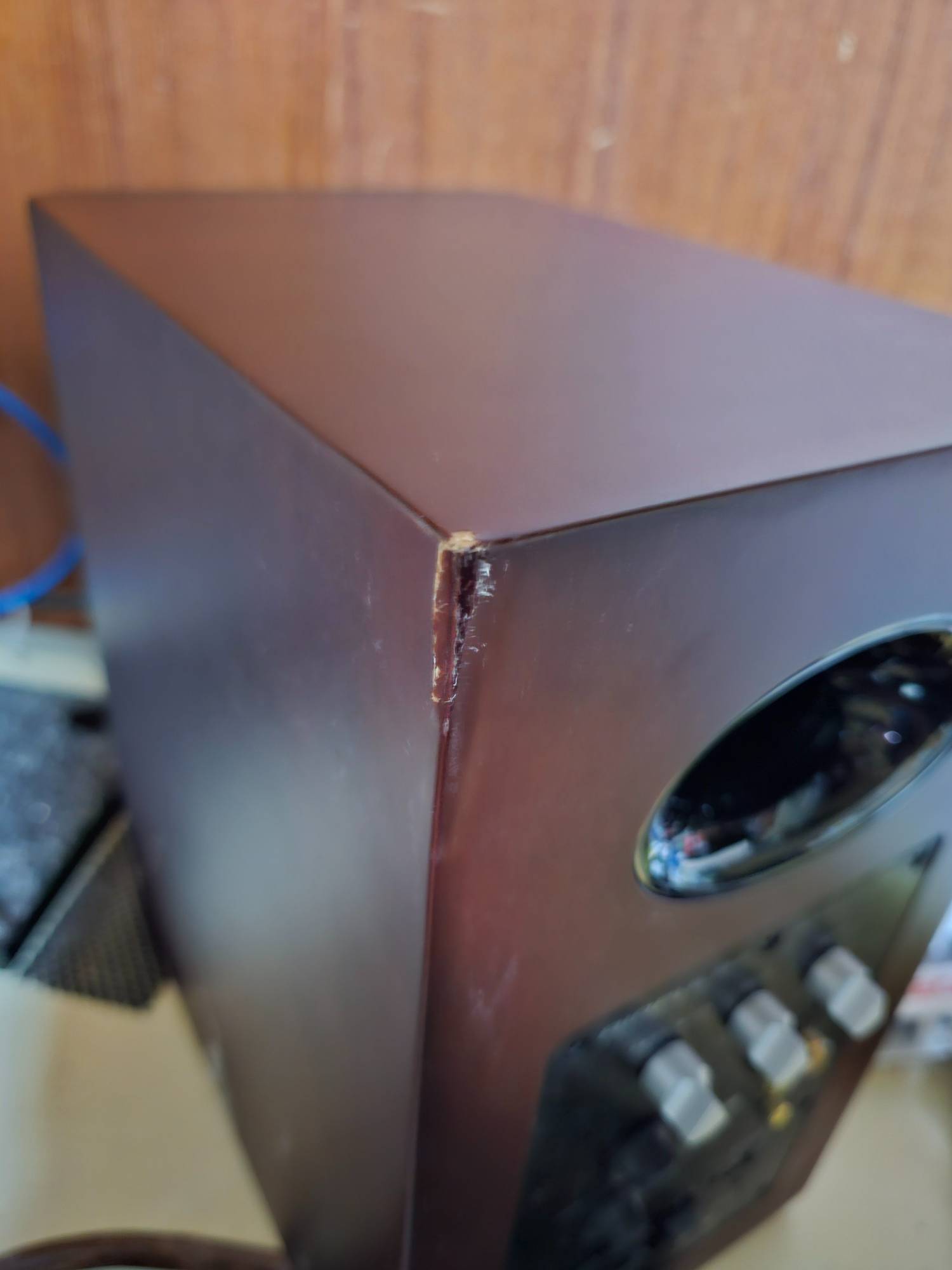 右聲道後面的皮有一點擦傷,收到貨時就有了,紙箱有破損,應該是物流造成,不影響聲音
