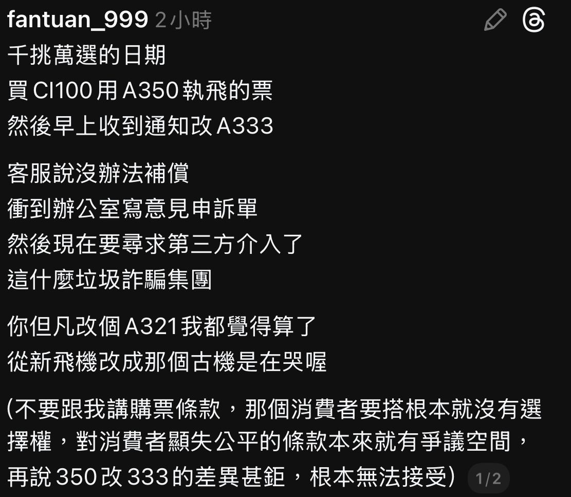 52F:→ taxlaw1991: 你買票時都同意可換機型的條款 而且每家都一樣 不爽 12/16 12:01