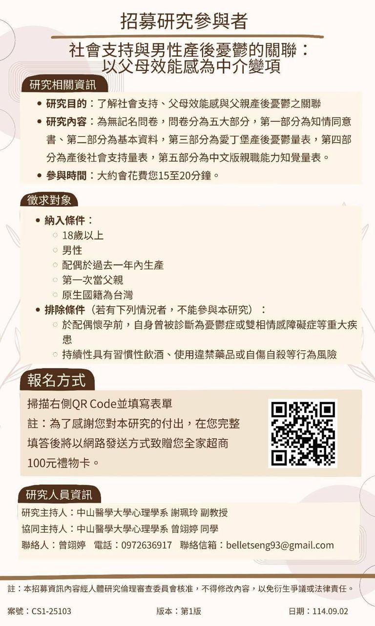1.問卷主旨/標題:〈招募表單〉伴侶產後憂鬱男性社會心理狀態調查