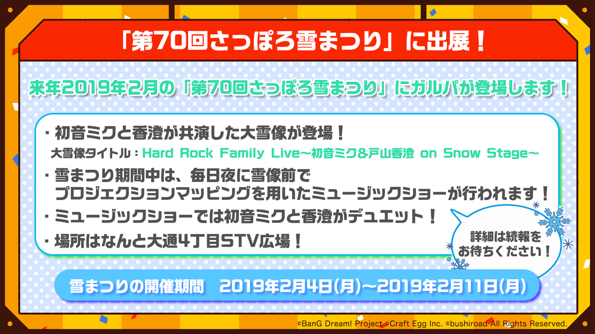 2/4~2/11在北海道舉辦的雪祭,將會有初音跟香澄共演的大雪像。