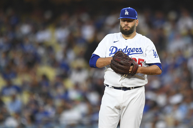 前次出賽先發4.1局失7分的道奇投手Lance Lynn,前4局只被擊出1安打,但5局下投了10