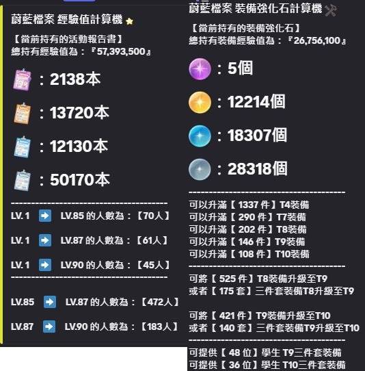 經驗/裝備珠: 1>90:庫存45人、T1>T9裝:庫存48人。