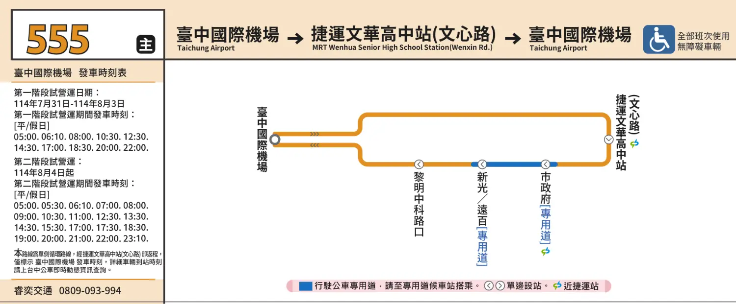 睿奕交通誠摯宣佈,全新機場接駁路線555路「臺中國際機場-捷運文華高中站(文心路)