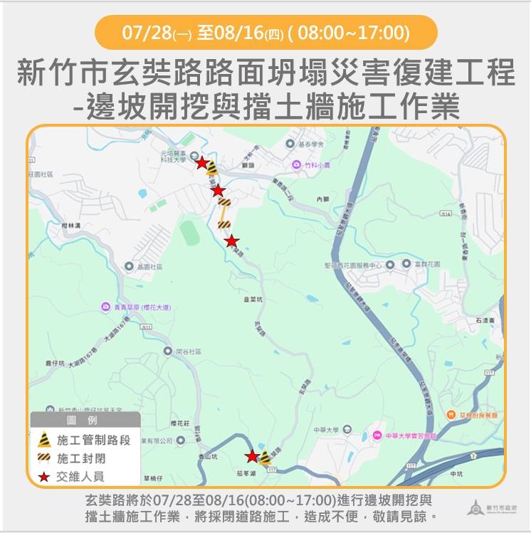 本市玄奘路進行開挖及擋土牆重建工程,於7月28日起至8月16日實施交通管制,公車【綠