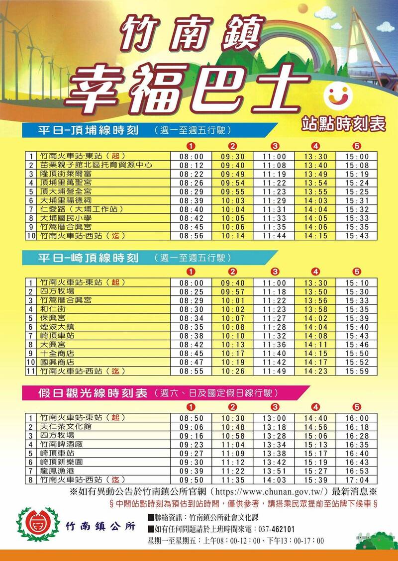 未來竹南鎮幸福巴士路線也將更改為頂埔線(週一至週五行駛)、 崎頂線(週一至週五