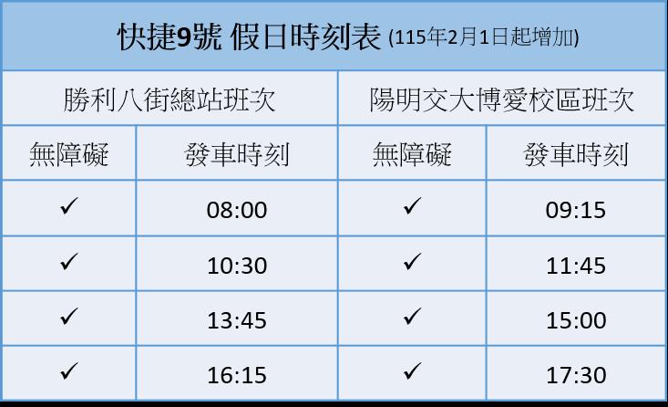 為增進大新竹生活圈往返便利性,快捷9號自今年2月1日起新增假日班表,共8班次,分別